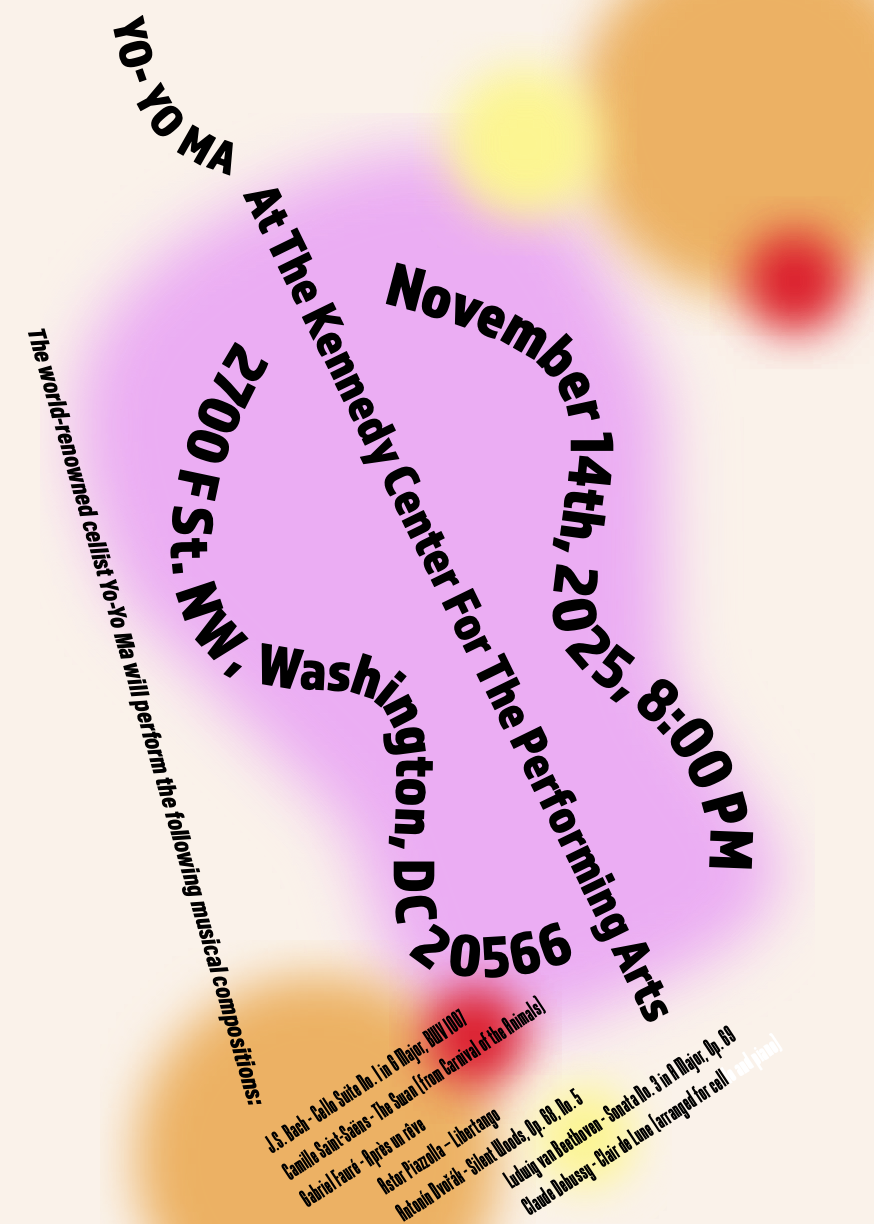 The Yo-Yo Ma posters are an exploration of the relationship of text within the confines of a given space. Each poster demonstrates a specific constraint I was given and was then asked to take the limitations each provides and work upon them. The left poster utilizes the text as the primary visual representation, while the right poster combines text manipulation with a pre-established image.